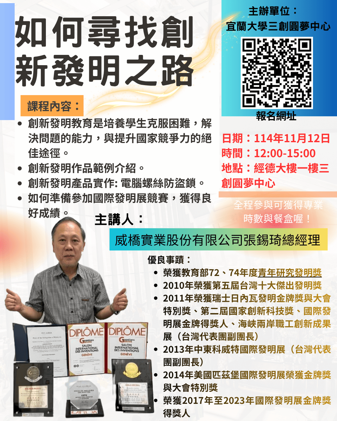 【114-1三創圓夢中心創新演講】如何尋找創新發明之路,歡迎報名,備有餐盒!